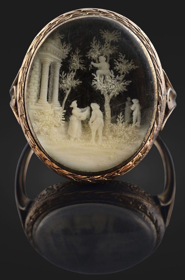 Officier à 16 ans, le voilà qui fait ses premiers pas dans la bonne société de Valence où il révèle une brillante ignorance des manières et apparaît aussi gauche et mal dégrossi qu’il se révèlera fin stratège. Il fait heureusement la rencontre de la spirituelle et distinguée Madame du Colombier dont la principale qualité se résume à sa fille Charlotte dite Caroline. Napoléon qui compte huit années de moins que la jeune fille s’abstint judicieusement de relever cette différence d’âge et connu sa première idylle. À Sainte-Hélène il se souviendra de ce matin d’été où « tout [leur] bonheur se réduisit à manger des cerises ensemble ». Durant son règne et en souvenir de cette innocente amourette, l’Empereur offrit à Caroline cette bague en or contenant sous verre une ciselure d’ivoire figurant deux personnages mangeant des cerises.