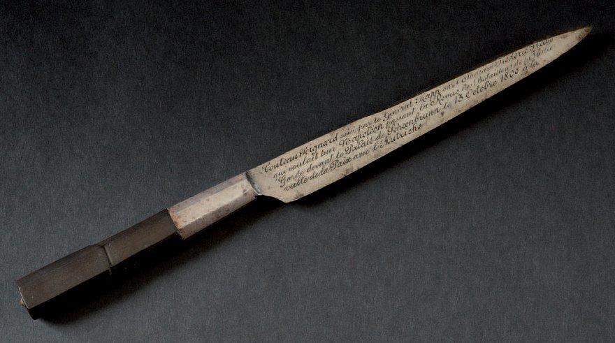 Le 13 octobre 1809, Napoléon échappa de peu à la lame de l’étudiant Friedrich Staps (1791?-1809 ; parfois orthographié Stabs) déterminé à tuer l’Empereur. Staps qui avait seul médité son acte fut intercepté par le Général Rapp (1771 - 1821) qui conserva l’arme.